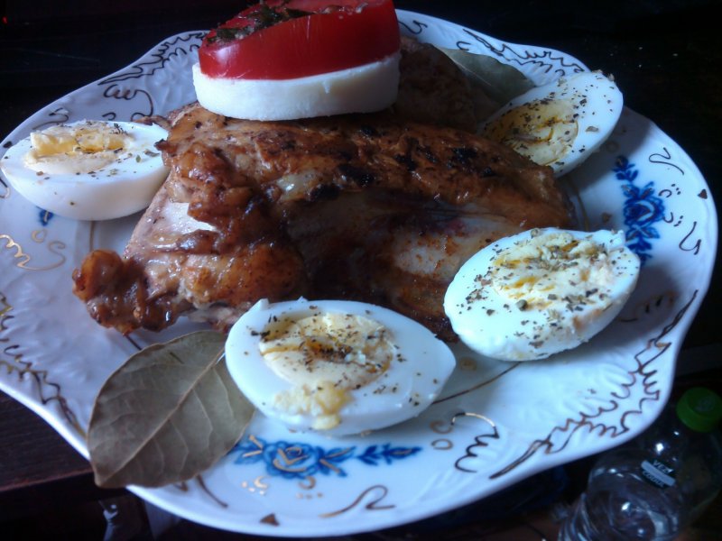 Se taie ouale in 2, se pune pe fiecare busuioc oregano si sare. Se pune puiul in mijloc cu o felie de cascaval si o felie de rosie se pune busuioc si marar pe ea, se orneaza cu foi de dafin.
