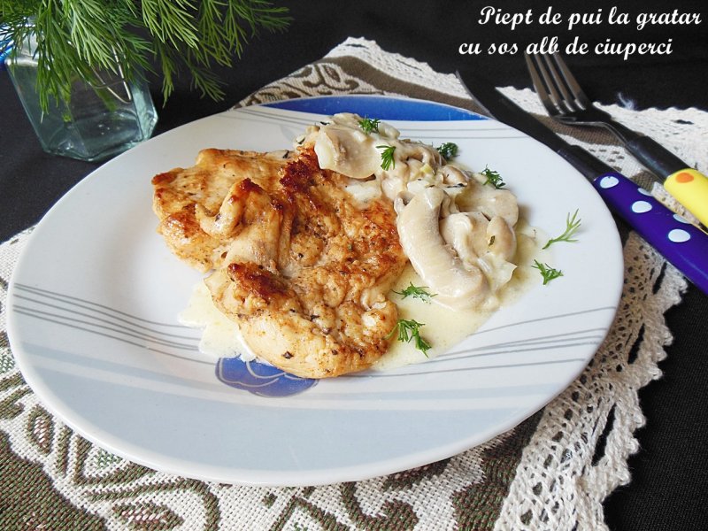 Pieptul se serveste cu sosul pregatit si putin marar verde tocat, pe care il presaram deasupra.