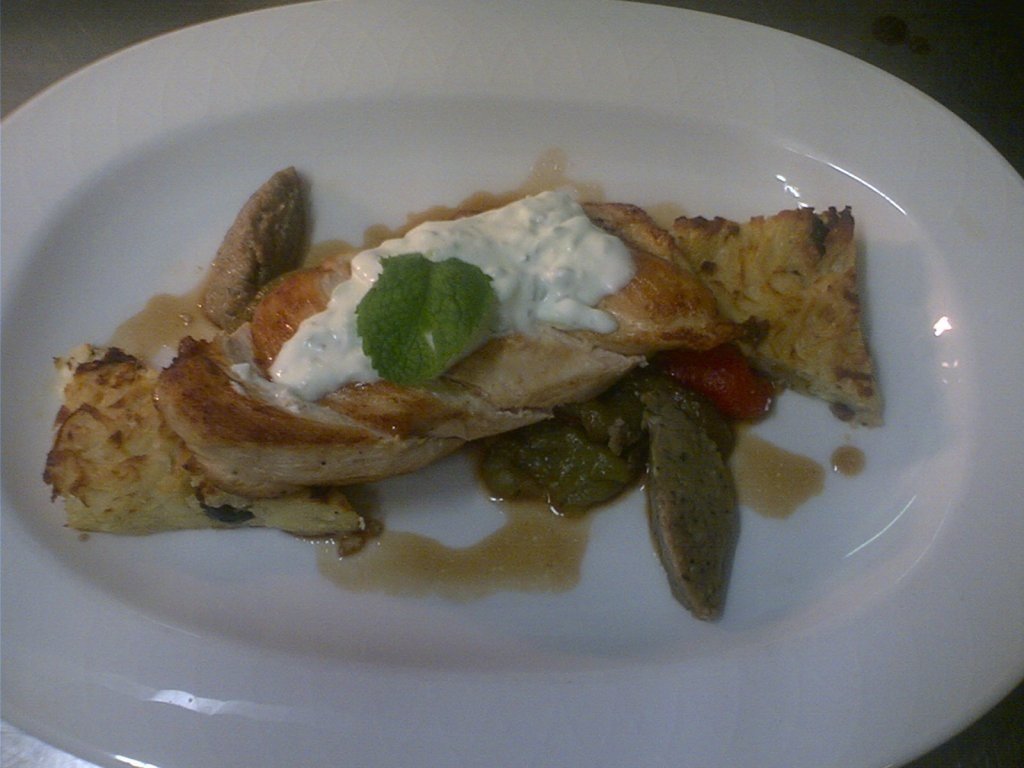 Ardeii copti se scurg si se aseaza intr-un colt al farfuriei cu o lingura de salata de vinete, cartofii in mijloc, puiul, apoi tzatziki.Ciabbata sau paine masline merge cu acest preparat, sau pita calda. Recomand un vin sec ca sa taie un pic prin aromele acestea puternice.Pofta buna!
