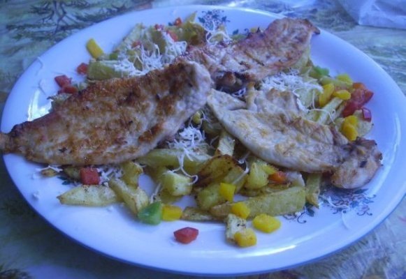 Se trece la aranjarea farfuriei, cartofii prajiti, pieptul de pui deasupra, se pune parmezanul ras deasupra si se pun pe marginea farfuriei garnitura de ardei.