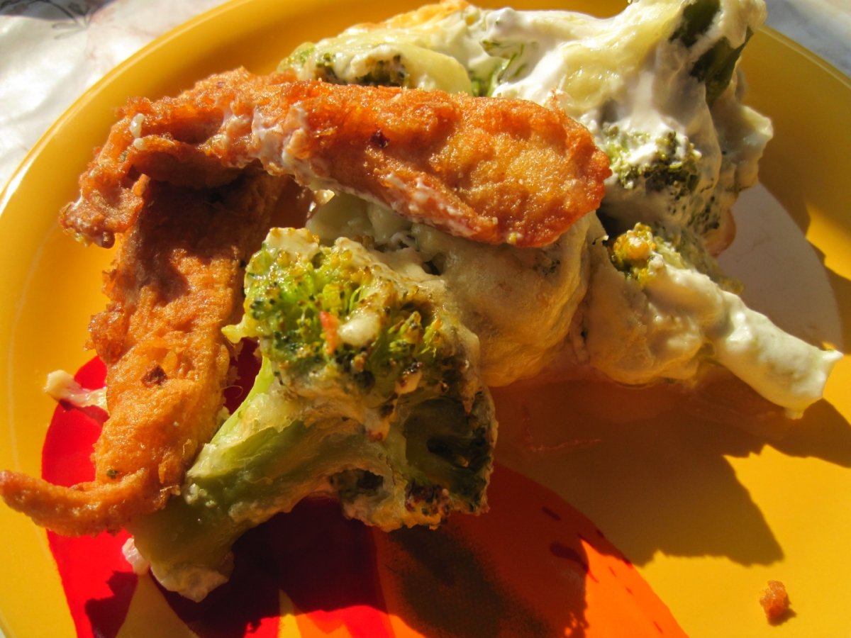 Cat timp brocoli-ul este la cuptor preparam pieptul de pui pane. Se bat ouale foarte bine, se adauga 2 linguri de faina si se potriveste de sare si piper. Fasiile din piepul de pui se dau prin faina, prin compozitia de oua si se pun la prajit in uleiul incins pe ambele parti.