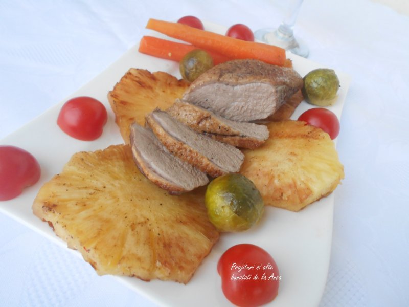 Alaturi de rata si ananas noi am servit morcovi si varza de bruxelles trase la tigaie dar se poate pune langa ea orez sau orice alte legume preferati.