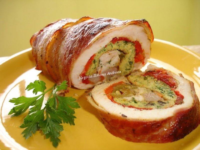 Pieptul se bate intr-o folie alimentara pentru a nu murdarii peretii dupa care exteriorul se condimenteaza cu 1 lingurita curry, 1 lingurita boia dulce, piper, ulei de masline si putin sos de soia si se intinde cu pensula. Pe interior se unge cu mustar clasic, deasupra lui se pune pe toata suprafata ardeii copti desfacuti apoi omleta facuta din 3 oua cu marar, branza, masline si ceapa verde. Peste ei se adauga castraveciorul taiat cubulete, cateva felii de caizer taiat bucati, morcovul cuburi si verdeata tocata. Se ruleaza usor, se imbraca in bacon si se strange cu sfoara. Se tine pana a doua zi la rece cand se trage la tigaie cu putin unt si ulei de masline ca sa prinda o crusta frumoasa deasupra. Dupa ce am intors-o pe toate partile adaugam zeama de la ardeii coptii si mai lasam cateva minte. Se da apoi la cuptor cu zeama formata in tigaie si 1 ardei copt si se unge tot timpul cu zeama din tava. Rulada se poate umple cu orice gasiti prin frigider. Se taie aproape rece pentru a-si pastra forma frumoasa. O puteti taia in felii rotunde sau o puteti taia onlic. Cartofii se taie evantai, se condimenteaza, se stropesc cu un mujdei de usturoi facut cu ulei de masline si se dau la cuptor.