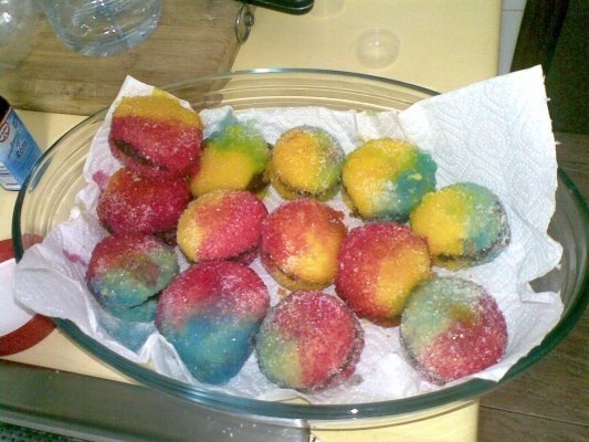 Amestecam miezul scos din ele cu nutella si umplem jumatatile lipindu-le una de alta astfel incit sa facem o bila. Se pune intr-un castron lapte si colorant rosu,in altul lapte cu colorant galben (eu am folosit si colorant albastru).
