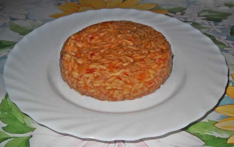 Intr-o cratita adugam uleiul si cand se incalzeste adaugam ceapa, morcovul si ardeiul.. Dupa 3-4 minute adaugam si rosiile.Orezul il curatam de impuritati , il spalam si il adugam si pe el peste legume. Ametecam sa nu se lipeasca , adaugam doua polonice cu supa in care a fiert carnea, acoperim cu capac si lasam sa fiarba la foc mic. Pe masura ce lichidul se evapora mai adaugam treptat cate un polonic de supa, pana ce orezul a fiert. Condimentam cu sare si piper.