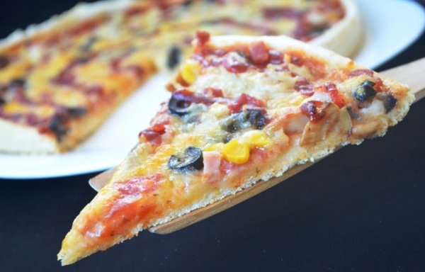 3.Ungeti tava de pizza cu ulei si puneti aluatul. Cu ajutorul unei pensule intindeti ketchupul, apoi puneti jumatate din mozzarella rasa, sunca/salamul, maslinele si ciupercile spalate si bine scurse de apa.Deasupra radeti restul de mozzarella si ornati cu putin ketchup.