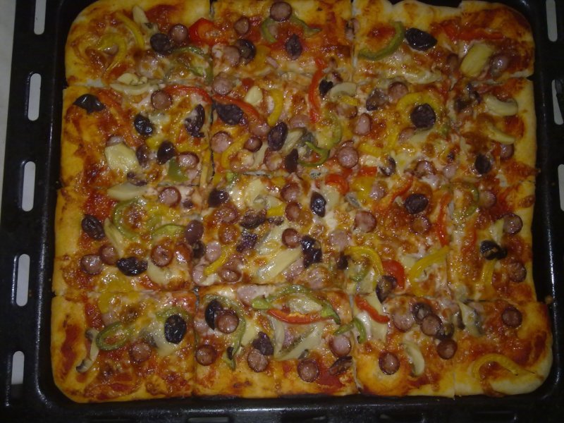 Adaugam un strat de cascaval ras, un strat de carnati taiati subtire, un strat de ciuperci, un strat de ardel taiat fideluta, un strat de masline fara sambure si la urma am presarat iar cascaval. Am folosit jumatate din ingrediente, iar cealalta jumatate a ramas pentru al doilea blat.