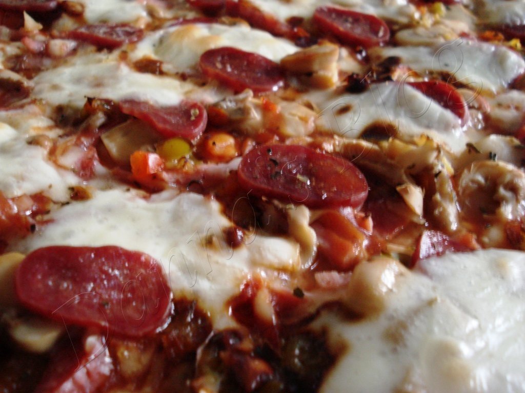 In forma de pizza,se intinde aluatul,adaugam sos de rosii pe toata suprafata,presaram condimente pentru pizza..,adaugam in ordine, sunca presata,cascavalul ras,ciupercile,ardeiul...