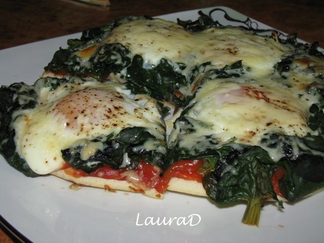 Dupa cele 10 minute, scoate pizza din cuptor, fa 4 adancituri in spanac cu ajutorul unei linguri si sparge un ou in fiecare adancitura.Presara pizza cu 25 gr branza Cheddar ramasa si da-o la cuptor inca 8-12 minute, pana cand albusul s-a intarit iar galbenusul a ramas moale.