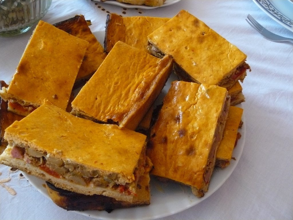 Se face un aluat cu apă, puţină sare, drojdie si apa calduţă (ca la paine), se unge tava sau se tapetează cu hartie de copt.Se intinde aluatul, se pune in tavă, se unge cu puţin kethcup, apoi se pun ciuperci călite cu ceapa, salam tăiat cubuleţe, 2-3 castraveti acri, raşi şi storşi, felii de gogoşar, se rade 200-300 g telemea, cascaval (ce ai).Se bat 3-4 ouă, cu 3-4 linguri de smântână şi 300-400 g de ketchup mai picant şi se toarnă deasupra.Se coace la foc potrivit 40-50 minute.