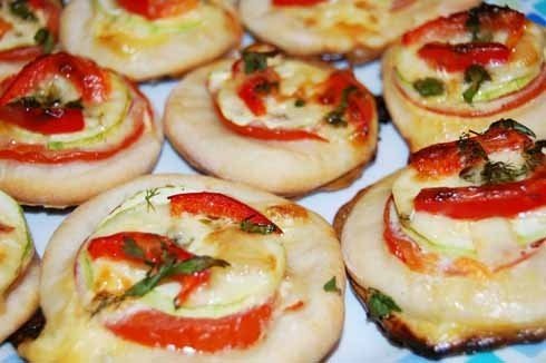 Presarati faina pe masa curata, intindeti aluatul intr-o foaie de 3 mm grosime. Asezati-l pe o tava de copt si ungetil cu un ou batut apoi puneti-l la frigider. Coaceti ardeii grasi. Adaugati dovlecelulcere cu coaja in sus pe gratarul incins in prealabil la putina vreme dupa ce ardeii grasi s-au copt si coaceti-l pana cand coaja se inchide la culoare, fara a se curata. Feliati dovleceii in semicercuri de aproximativ 5 mm grosime. Taiati si ardeii copti curatati de coaja tot in fasii de 5 mm. Cu o forma rotunda de aproximativ 5 cm in diametru, taiati cercuri in aluat asezandu-le apoi in 2 tavi unse. Acoperiti rondelele de aluat cu o felie de rosie, o fasie de ardei gras galben si una de ardei rosu, dovlecel si cateva cuburi de mozzarella apoi presaratile cu ierburi uscate. Coacelti-le in cuptor 10 – 15 minute pana se umfla si se rumenesc usor.