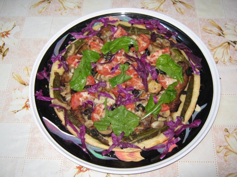 Este o reteta de pizza pe care am mancat-o la Veneţia; la decor m-am inspirit de o pizza pe care am mancat-o la Milano si care mi s-a parut foarte de efect presarata cu rucola si varza rosie.