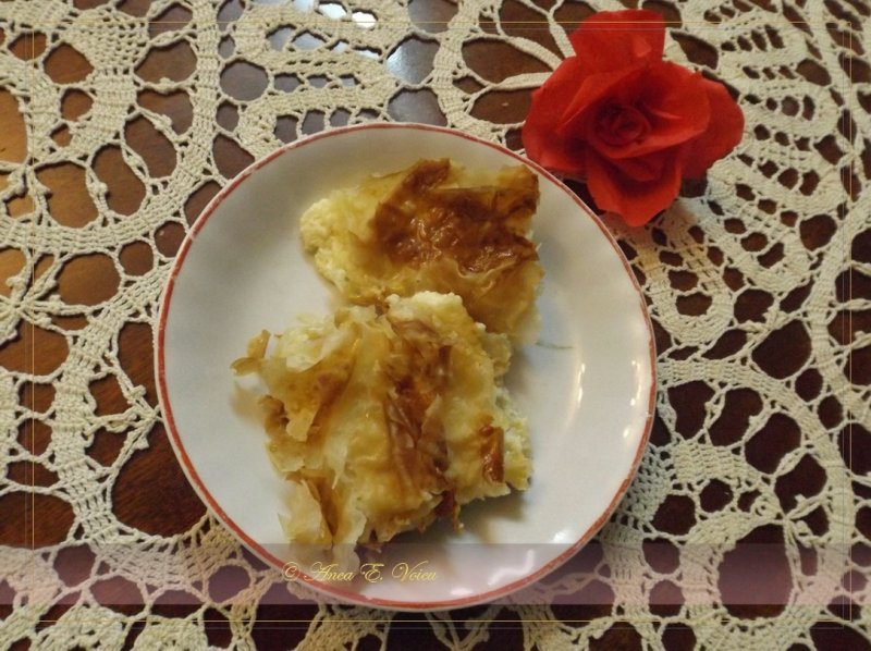 Se adauga crema de branza preparata din: branza, un praf de sare, un ou, zaharul, zaharul vanilat. Se presara din loc in loc coaja de portocala (tinuta in zahar, la borcan) si stafide.