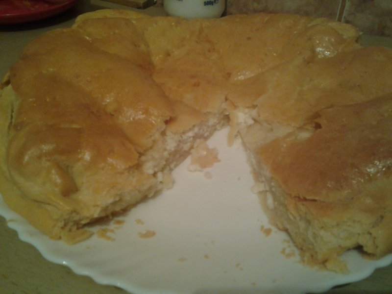 Se pregateste locul pentru framantat (dupa cele 30 minute de dospit) se presara faina pe masa de lucru si se framanta bine, apoi se intinde cu sucitorul o foaie rotunda care se taie prima data in 4 lasand centrul netaiat, ca un cerc. Apoi se mai taie fiecare bucata ca sa se obtina 8 bucati finale. Se pune ulei in centru, se intinde cu mana pe tot centrul si apoi branza framantata, se ia cate o bucata de coca si se inveleste branza, se unge cu ulei foaia de deasupra, se presara branza si tot asa cu fiecare bucata pana se termina cele 8 bucati. Se ia usor si se intoarce cu fata in jos, apoi se mai intinde putin cu sucitorul.