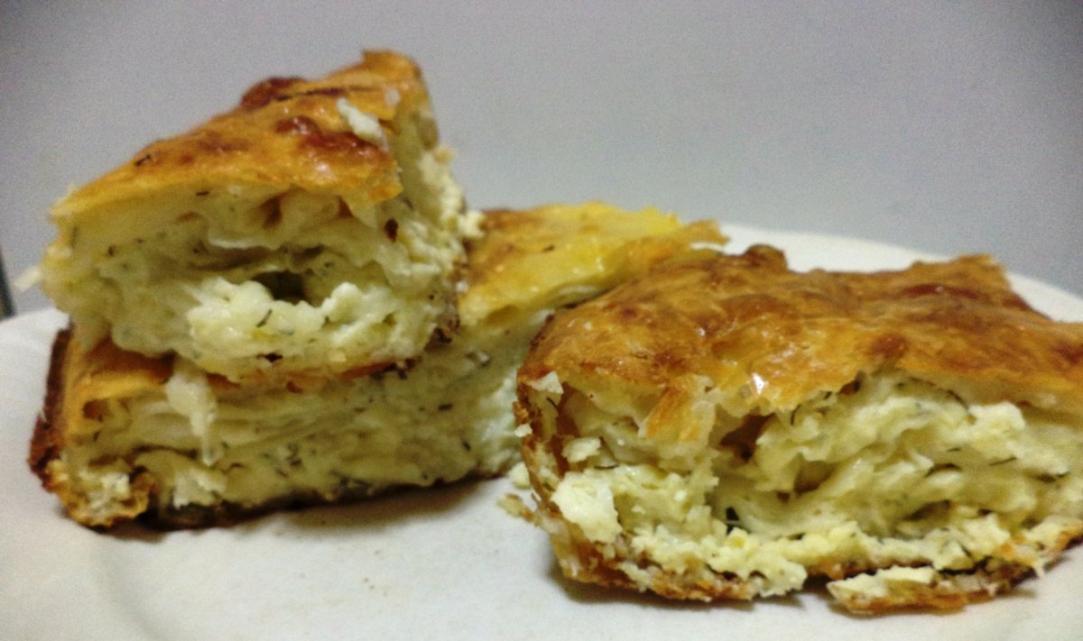 Apoi începe să asamblezi plăcinta: 4 foi pe fundul tăvii, cu marginile lăsate ca în imagine, să o poți împacheta frumos la sfârșit. Adaugi din amestecul de brânză cu ierburi, din nou 4 foi, de data asta rupte cât fundul tăvii, din nou brânză. Poți alterna așa până epuizezi foile și amestecul de brânză, dar și cât te lasă tava. Pe mine m-a lăsat preț de 3 straturi. Plăcinta crește la coacere, așa că ai grijă să-i lași spațiu, altfel dă pe dinafară.