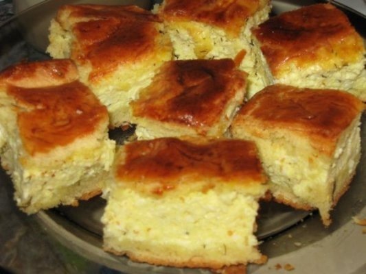 Pentru a fi mai usor de taiat, inainte de a fi introdusa la cuptor, se taie cu un cutit foarte ascutit prima foaie, pina aproape de brinza, in patrate de 5 cm pe 5 cm.