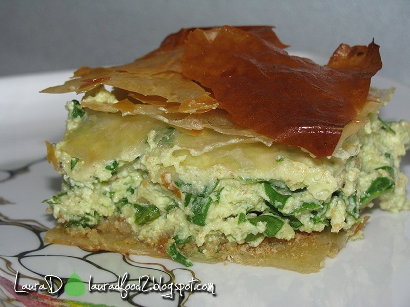 Fiecare foaie de placinta se unge cu 1 lingurita ulei de masline.Jumatate din foile de placinta de aseaza una peste alta in tava pregatita si se presara cu 50 gr pesmet.Se pune umplutura, se niveleaza apoi se acopera cu restul foilor de placinta puse una peste alta.Placinta se da la copt 25-30 minute pana cand s-a rumenit.