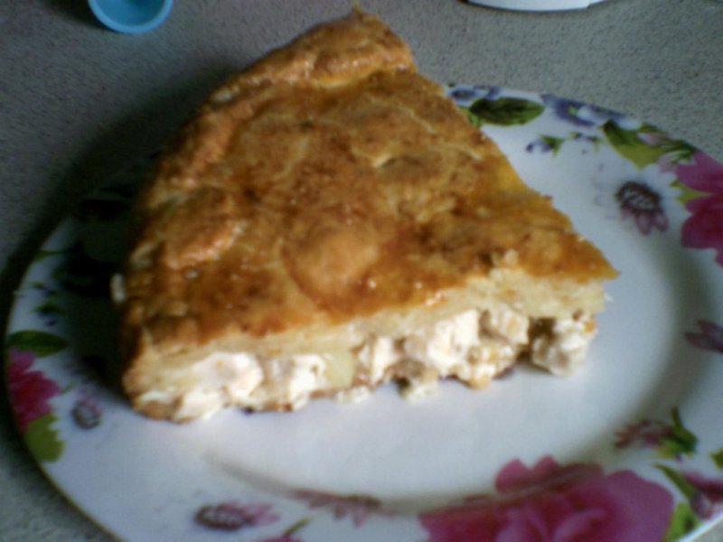 Aluatul se imparte in doua bucati (una mai mare si una mai mica).Se intinde bucata cea mai mare si se pune intr-o tava de cuptor sau o cratita mai mare.Se toarna umplutura si se uniformozeaza.Se intinde si cealalta bucata si se pune peste umplutura si se unge cu galbenus de ou.