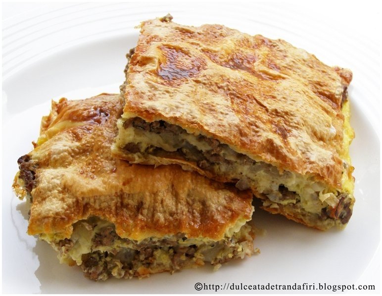 Foile de placinta se decongeleaza din timp, lent, in ritmul lor. Ceapa si usturoiul le tai marunt si le calesti in putin ulei, apoi adaugi carnea si lasi la foc potrivit pana cand aceasta isi schimba culoarea iar zeama scade (cam 15 min). Amesteci din cand in cand, cat sa nu se lipeasca. Pui condimentele, stingi focul si lasi compozitia sa se raceasca.