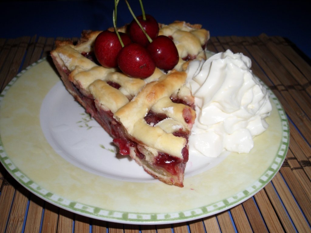 Spumam untul la robot sau cu mixerul, adaugam faina, un praf de sare si 4-5 linguri de zahar. Amestecand vom obtine un aluat nisipos peste care vom pune crema de branza si vom continua sa amestecam. Adaugam treptat apa rece pana obtinem o coca. Daca mai e nevoie – daca coca este prea lipicioasa, mai adaugam un pic de faina. Punem coca pe o folie alimentara formand un bol si o dam la frigider pentru cateva ore sau o ora la congelator. Cand o scoatem, o taiem in doua, un sfert din ea o pastram pentru grilaj, iar din partea cea mai mare intindem o foaie de marimea formei in care o vom coace, cam de 1-1.5 cm grosime. Tapetam tava cu unt si faina. Ajutandu-ne de un sucitor, transferam foaia in forma, taiem surplusul ce iese din forma, intepam foaia cu furculita din loc in loc. Amestecam ciresele cu 3-4 linguri de zahar, amidonul alimentar si esenta. Turnam ciresele peste foaie. Din bucata ramasa, intindem o alta foaie si decupam fasii pe care le asezam apoi deasupra cireselor formand o retea. Ungem fasiile cu lapte amestecat cu o lingurita de zahar. Se da la cuptor aproximativ 40 de minute sau pana trece testul scobitorii. Se poate pudra cu zahar pudra, servi alaturi de inghetata sau frisca. Sa o savurati cu multa placere! http://pasiunilealynei.wordpress.com/