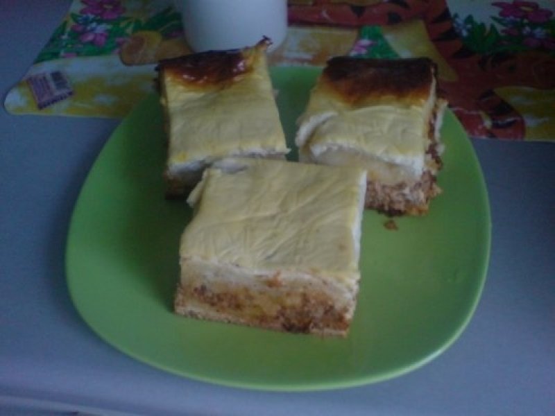 Pentru aluat se amesteca toate ingredientele (s-ar putea sa mai necesite 2-3 linguri de apa) si se fac doua foi. Se unge tava cu unt, se aseaza prima foaie, se pune umplutura de ciuperci apoi a doua foaie. Cat este cruda se taie in patrate si se acopera cu cele 3 oua batute cu 200 g smantana. Se da la cuptor 40 - 50 de minute. Se poate presara si cascaval dupa ce o scoateti din cuptor.