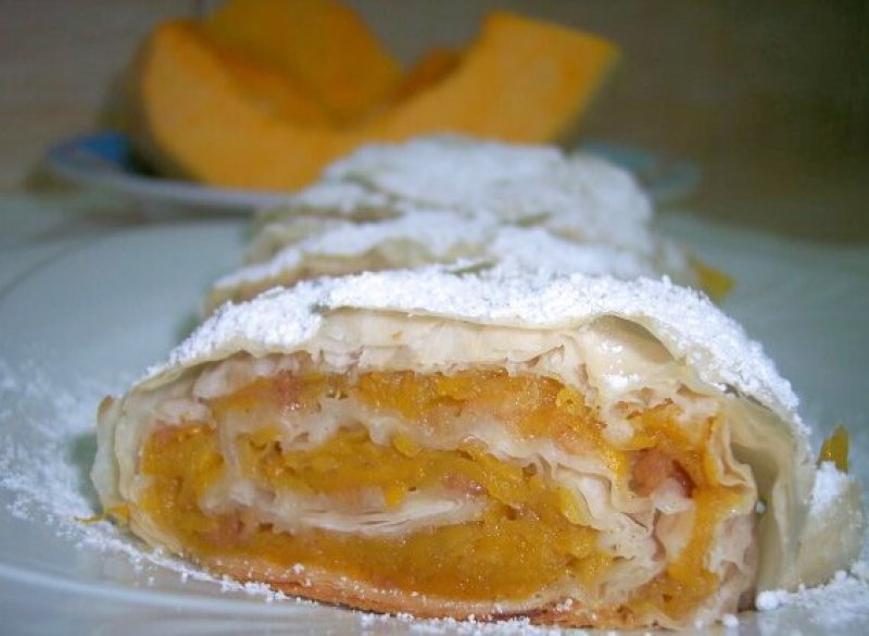 Foile se impart in doua din care se fac doua rulade. Fiecare foaie se unge cu untul topit. Se presara o lg de pesmet dupa care se intinde jumatate din compozitie. Se ruleaza strans pe lungime si se aseaza intr-o tava. La fel se procedeaza si cu restul si se da la cuptor la 180 de grade pana se rumeneste frumos deasupra.