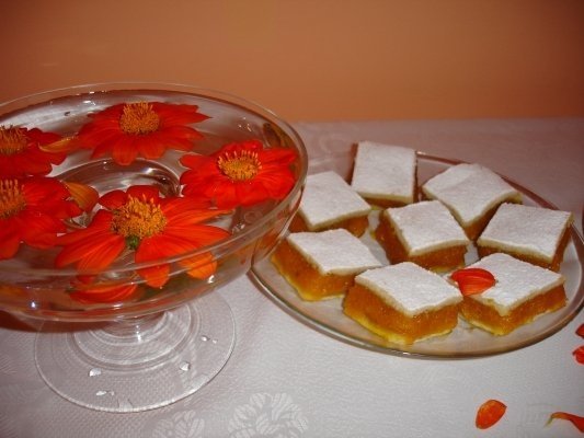 Peste compozitia racita punem oul (galbenusul frecat cu un praf de sare si albusul batut spuma), bicarbonatul stins cu otet si amestecam bine. Punem faina treptat si framantam pana obtinem un aluat moale. Il lasam un pic la odihnit pana facem umplutura. Din aluat facem 2 bile si intindem doua foi, una o asezam in tava unsa si tapetata cu faina sau hartie de copt, peste asezam compozitia, deasupra cealalta foaie pe care o intepam cu furculita din loc in loc. Se da la copt 30 min la 165 C. Se lasa la racit bine, se taie patrate si se pudreaza cu zahar pudra vanilat.