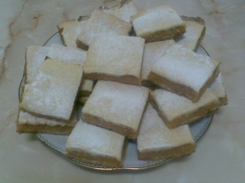 Se scoate aluatul din frigider si se imparte in 2.Se pune prima foaie intr-o tava de aragaz tapetata cu hartie pergameni,se pune deasupra umplutura scursa bine si se acopera cu a 2 foaie.Se baga in cuptorul preicalzit la 190gC pentru 20-30 de minute.Se scoate si se pudreaza cu zahar pudra.