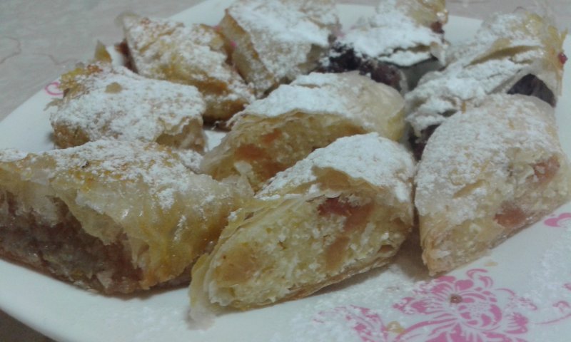Asezam pe o planseta tot cate 2 foi le ungem cu pensula cu putin ulei si asezam inca 2 foi le umplem pe rand (vezi foto) cu mere apoi cu branza apoi cu gem apoi cu branza sarata.Deasupra le ungem cu pensula cu ou .Peste ruloul cu branza sarata punem putin susan. Cele ce mere si gem le facem de post iar cele cu branza le facem de dulce.SUNT SUPER DE BUNE.