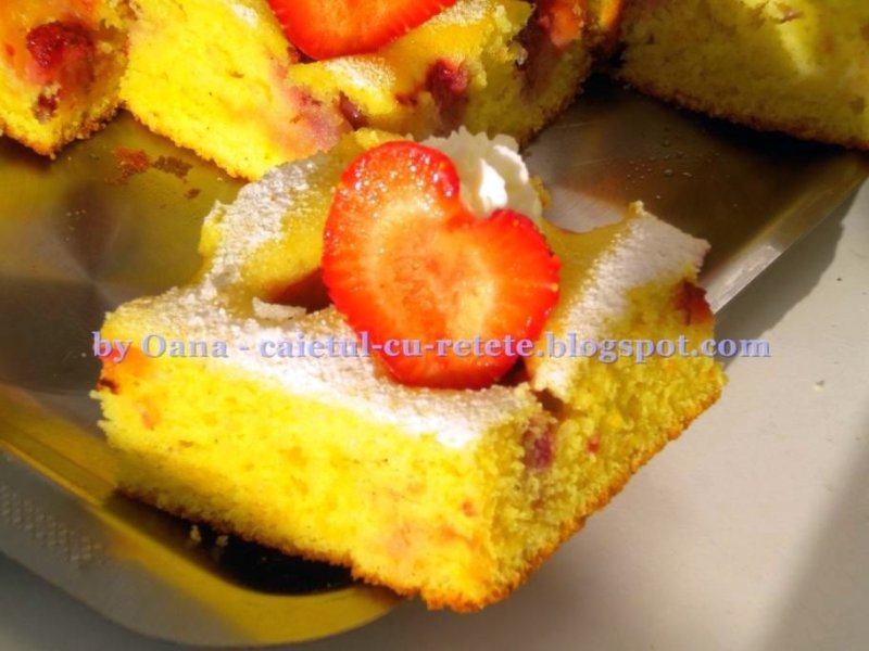 Ouale se mixeaza intregi cu zaharul pana cand compozitia devine albicioasa si consistenta. Se adauga laptele, uleiul, coaja rasa de lamaie si portocala, esenta de vanilie, zahar vanilat, iar la urma faina amestecata cu praf de copt. Rezulta un aluat fluid care se pune in tava de aragaz tapetata cu hartie de copt. Fructele (capsuni, in cazul de fata) se spala si se taie jumatati sau sferturi, depinde ce fructe aveti, ori se scot samburii daca e cazul, si se rasfira peste aluat. Se da la cuptorul incalzit in prealabil timp de cca 30 de minute la foc potrivit (180 de grade). Se face testul cu scobitoarea si dupa ce se scoate din cuptor se lasa la racit in tava. Rece, se desprinde cu grija de pe hartia de copt, se pudreaza si se portioneaza. Am ornat si cu cate un mot de frisca si cu cate o felie de capsuna. Pofta buna!