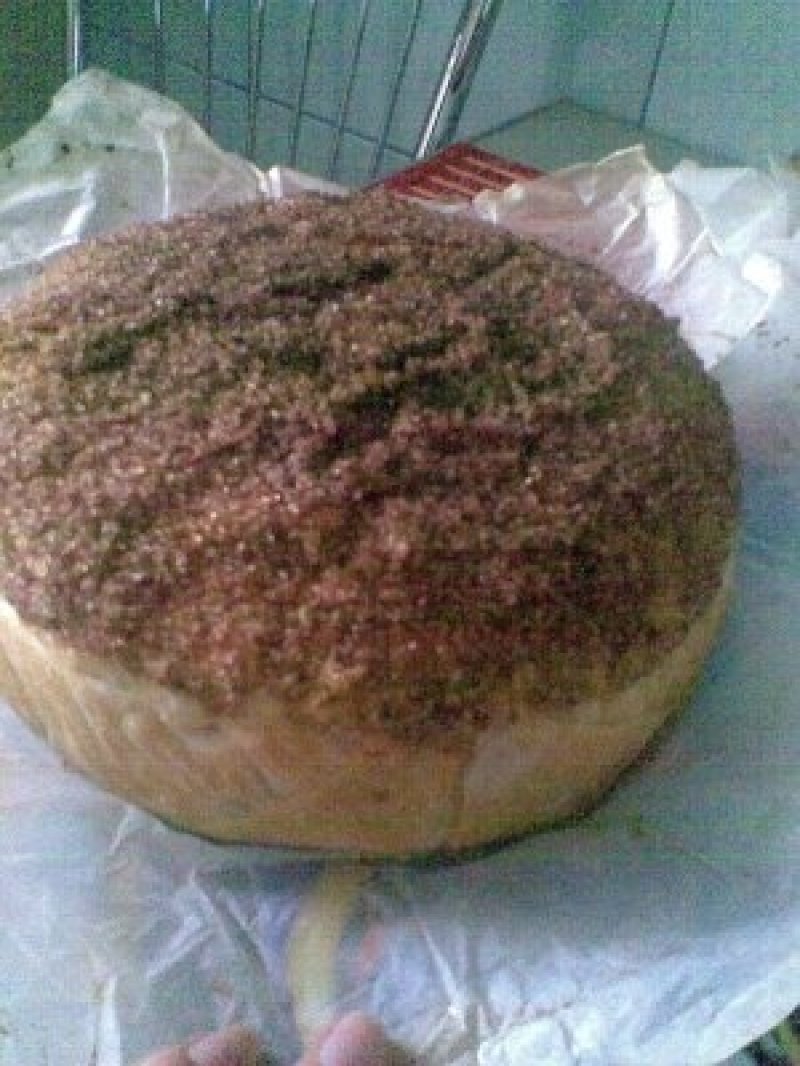 Se presara zahar aromat cu scortisoara peste cele 3 foi, avand grija sa acoperiti si marginile. Deoarece tava este rotunda foile de placinta se pun in cruce(una pe lungime, urmatoarea pe latime, pentru a se putea la sfarsit aduna marginile spre mijlocul tavii).