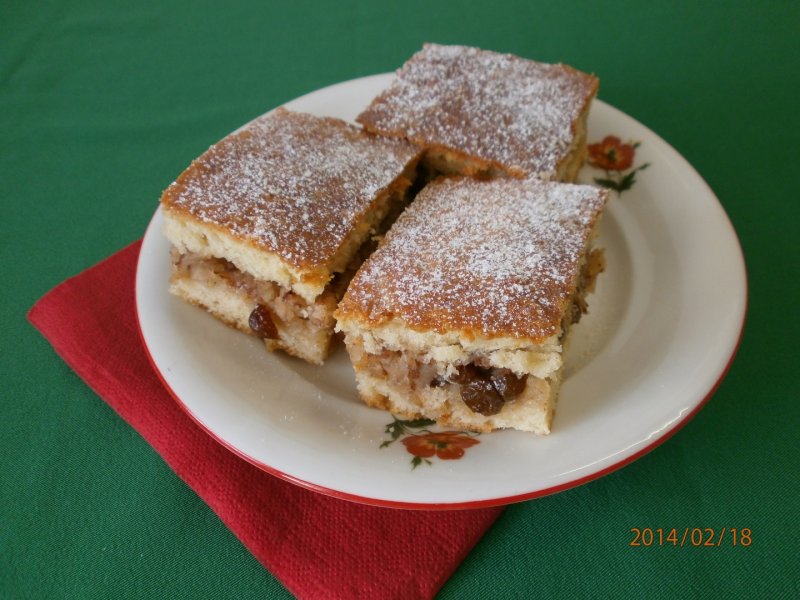 Placinta se taie în tavă, caldă sau rece si se pudreaza cu zahar.