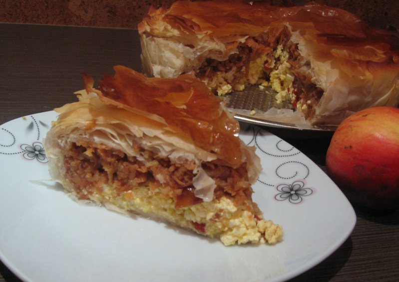 Procedam la fel pana cand ne raman 4 foi; pe acestea le vom pune deasupra. Asezam in tava, peste foile suprapuse, branza si o nivelam apasand usor. Deasupra ei punem merele calite si racite si nivelam din nou.