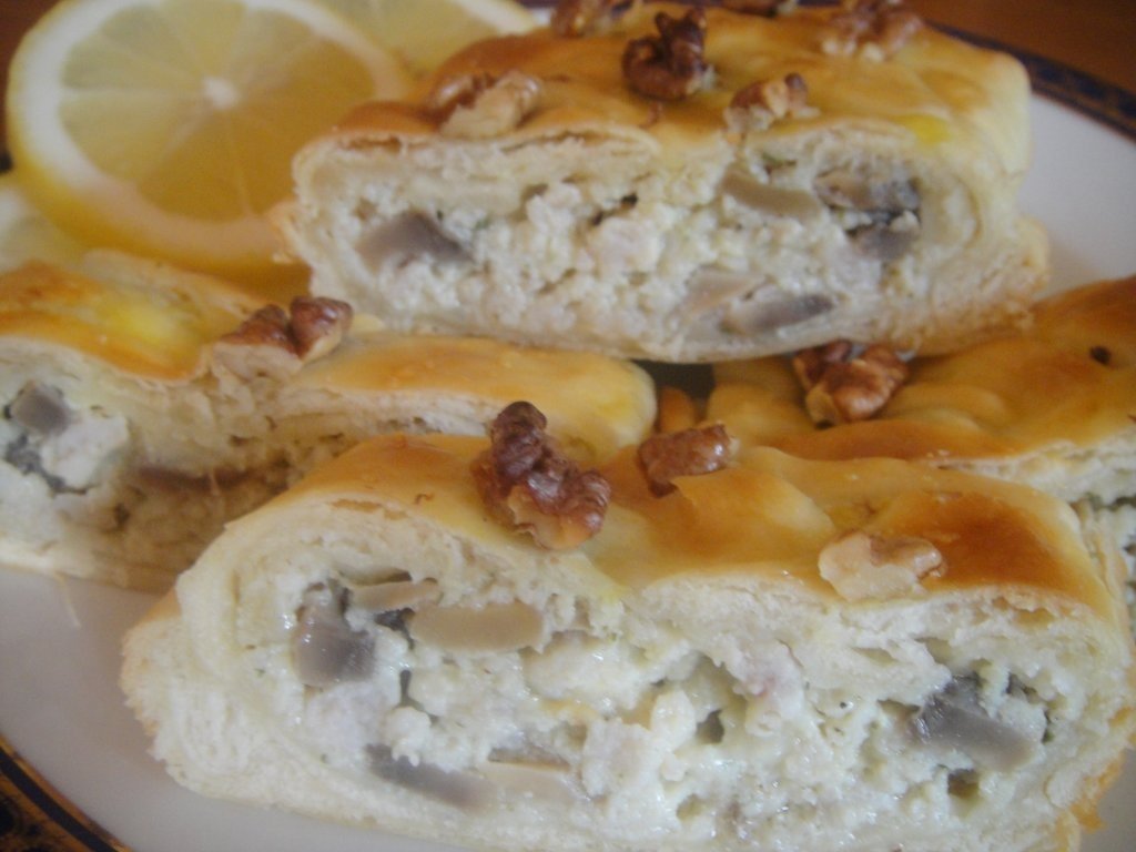 Calim ceapa bine,adaugam ciupercile iar la sfarsit fileul de peste tocat.Se condimenteaza dupa gust,iar cand s a racit adaugam 1 ou si cascaval ras in compozitie.impartim coca si compozitia in trei parti egale.Intindem o foaie,punem umplutura in mijloc si impletim aluatul.Se da la cuptor preincalzit la 180 gr timp de 40 min.Pofta buna!