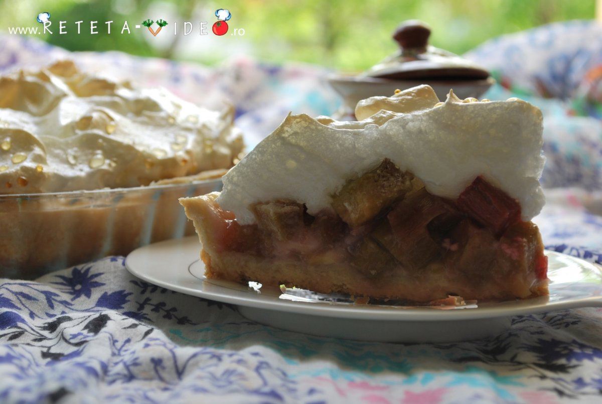 Dupa aproximativ o ora, cand umplutura de rubarba incepe sa faca bule, scoatem placinta din cuptor. Rasturnam imediat bezeaua deasupra si o distribuim usor pe toata suprafata tartei. Reducem temperatura cuptorului la 15 de grade si introducem prajitura cu rubarba in cuptor pentru inca 10-15 minute.