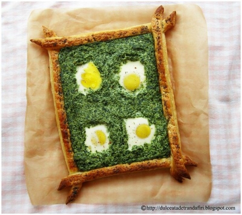 Patru oua si-un spanac s-au dus la fotograf sa-si faca poze impreuna si asa a rezultat fotografia de mai sus, "inramata" in foietaj :) .Satioasa si gustoasa, placinta a primit ok-ul chiar si de la sotul meu care in mod obisnuit nu mananca spanac. Asadar, pentru pofticiosi si mofturosi deopotriva, o mancare cu aer mediteranean.