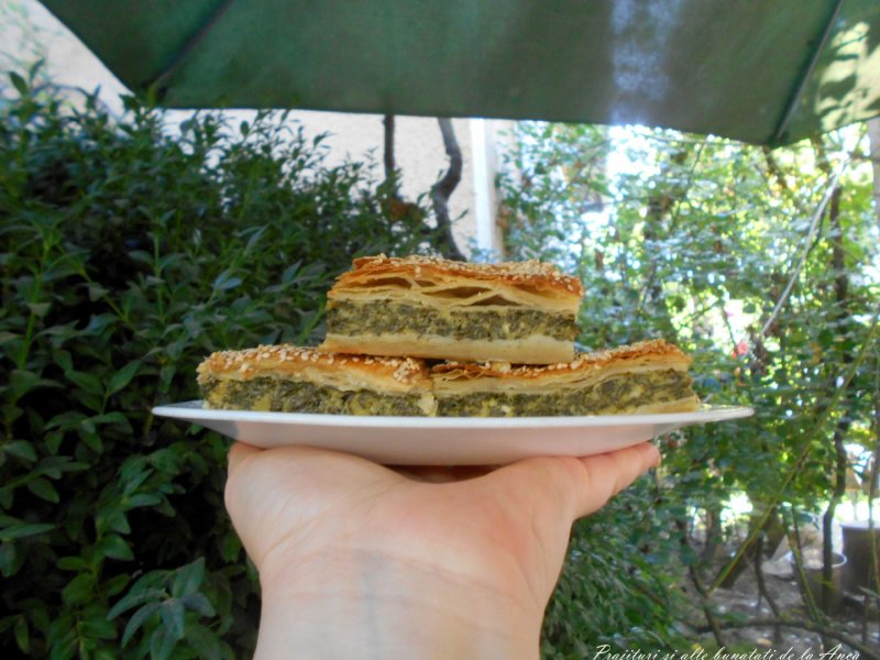 Intr-o tava, am intins o foaie de aluat de foietaj, am pus deasupra umplutura de spanac si deasupra a doua foaie de foietaj .