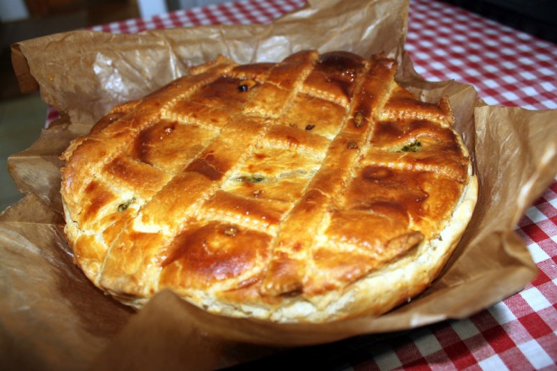 Turnam compozitia, peste care adaugam a doua foaie de aluat si modelam intr-o forma rotunda.Foaia care acopera compozitia o putem modela sub forma unui grilaj.