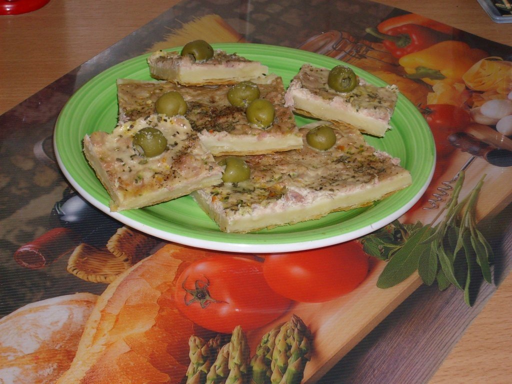 Se pune la dezghetat aluatul insa nu se lasa sa se dezghete de tot, doar cat sa poata fi pus in tava, apoi se da la cuptor 15 min. Intre timp se prepara compozitia cu ton, astfel: Se bate oul, apoi se amesteca cu smantana si cu tonul scurs de sucul propriu. Se scoate aluatul din cuptor si se pune compozitia din ton deasupra, apoi se pipereaza si se sareaza dupa gust, se presara niste busuioc uscat sau proaspat tocat, apoi punem maslinele verzi si presaram deasupra parmezan ras. Se da totul la cuptor inca 20 min.