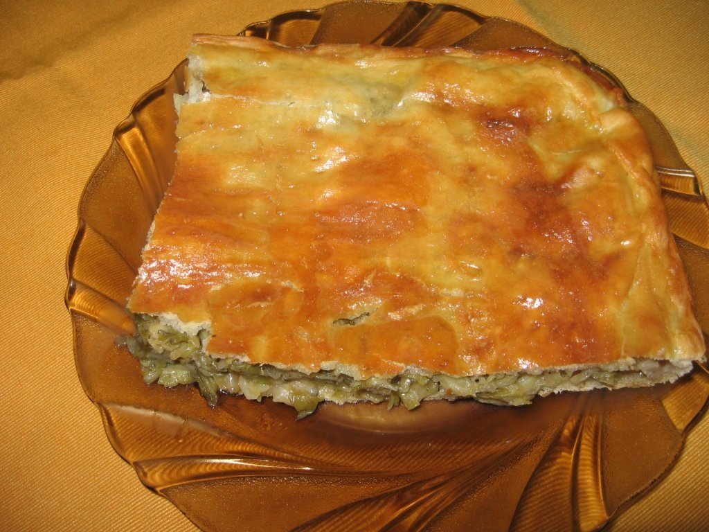 Se pune varza, se uniformizeaza si se pune a doua foaie de aluat, se lipesc marginile foilor cu degetele, se impunge cu furculita, se unge cu ou si se da la cuptor 45 de minute.