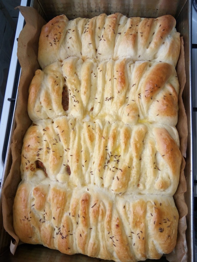 Aluatul se lasa la dospit, iar in timpul acesta se caleste varza cu ceapa, sare, piper.