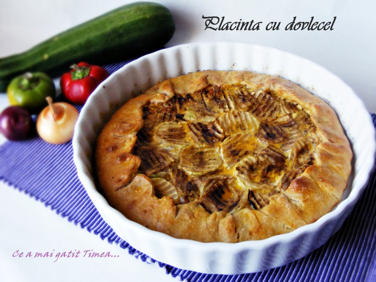 Ungem aluatul cu sosul chili peste care asezam ceapa si ardeiul. Batem oul + albusul cu o furculita, punem putin sare si piper si turnam peste legume. Deasupra asezam dovlecelul de jur imprejur pe toata suprafata. Tragem marginile aluatului peste umplutura.