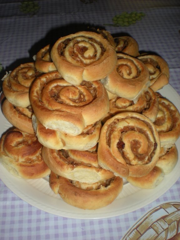 Dupa perioada de dospire, intindem aluatul intr-o foaie de 0,5 cm pe suprafata de lucru infainata . Intindem pe toata suprafata foii compozitia de mere si formam un rulou.Il taiem cu cutitul in rondele sau cu ajutorul unei ate mai grosute pe care o bagam sub rulou si tragem hotarat capetele atei in sens contrar ( ca atunci cand facem un nod la sireturi).