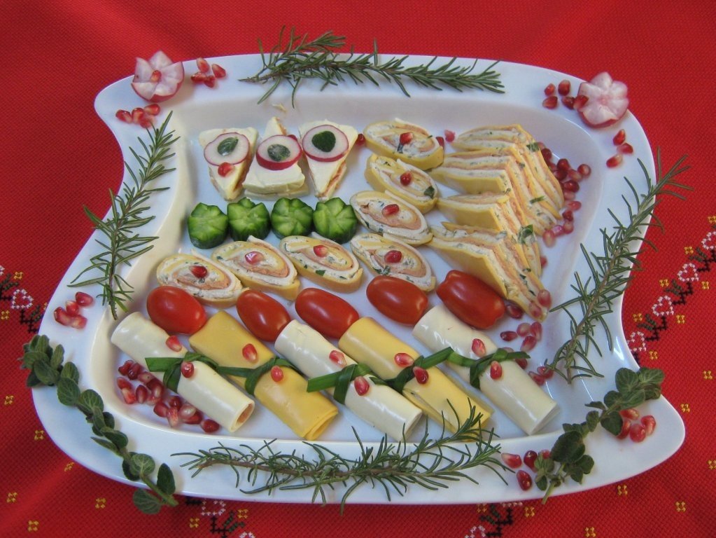 Se aseaza rolurile si feliile de branza pe un platou si se decoreaza dupa gust cu rosii”cherry”, castraveti, fire de rozmari, fire de oregano verde, seminte de rodie.