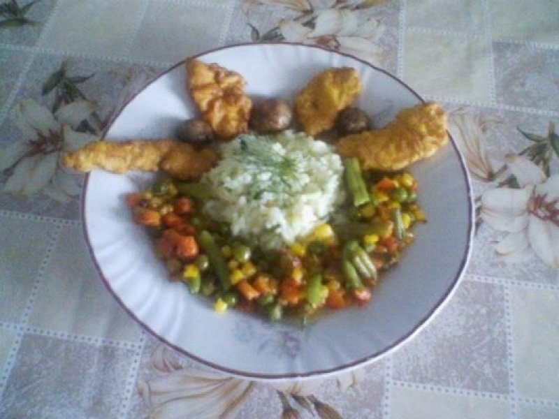 In acest timp se pun la fiert ciupercile timp de 15 minute, dupa care se calesc intregi sau se dau la cuptor pentru 10-15 minute. Se calesc si legumele (eu am pus morcov, porumb, mazare si fasole verde) si se aseaza pe un platou dupa imaginatia fiecarei gospodine. Se orneaza cu un fir de marar. Daca nu tinem post, se pot adauga pe platou si cateva snitele sau orice alta friptura preferata.