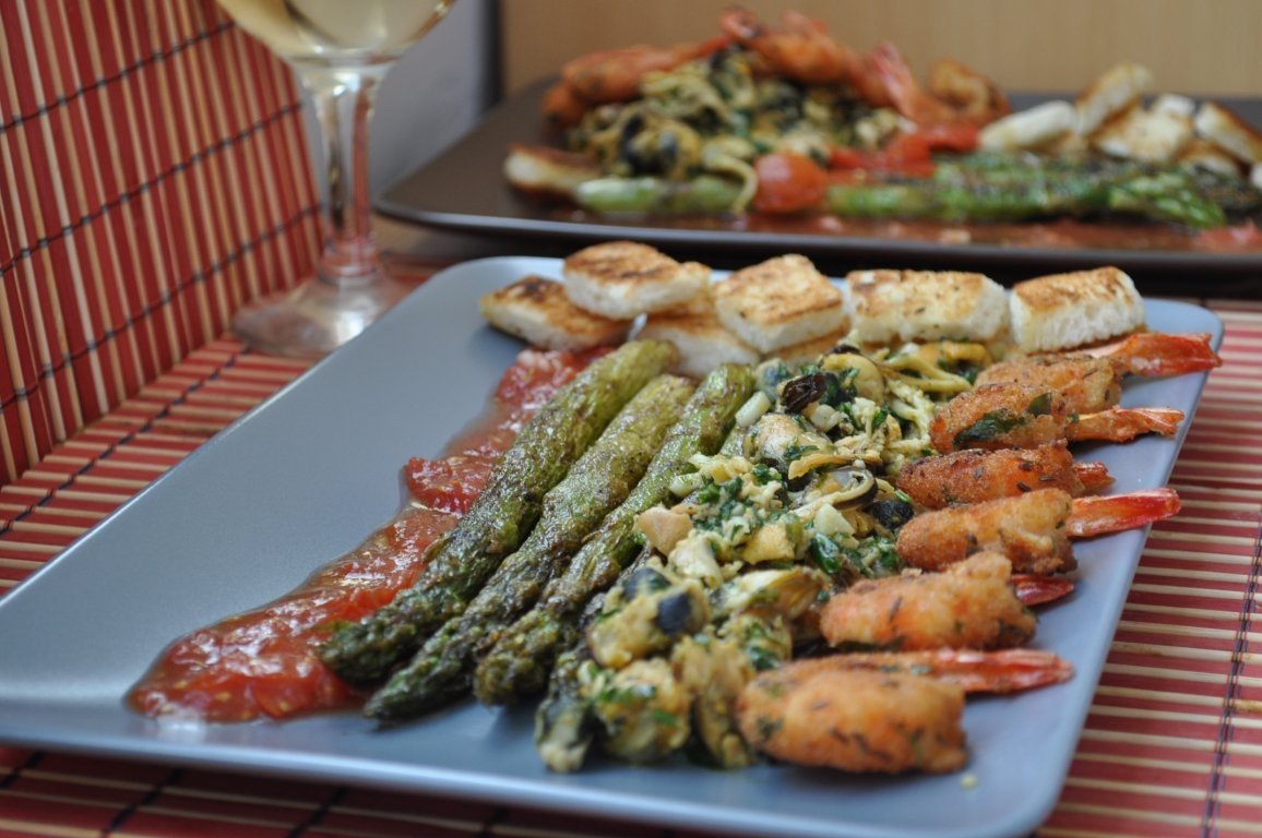 Toate se aranjeaza pe un platou, iar sosul de maioneza se pune intr-un bol.