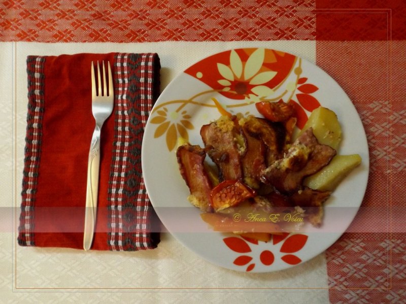 Pentru o masa de pranz de duminica am pregatit un platou taranesc din cartofi, costite afumate si condimentate, invelite in felii de branza de burduf si date la cuptor. Termenul de platou taranesc poate avea sens larg, caci fiecare il pregateste dupa gust si posibilitati. Asa ca pana la urma, fiecare foloseste ingredientele preferate. Eu am vrut ceva simplu si satios pentru o masa in familie :)