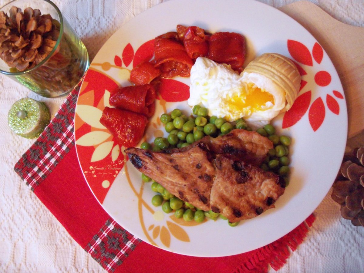 Pentru o cina in familie, am pregatit carne de porc la grill, cu mazăre (preferata mea), coşuleţe cu ouă ochiuri româneşti şi ardei copţi :) Coşuleţul este din napolitană şi e decorativ doar, întrucât se înmoaie de la ou, dar mie mi s-a părut simpatic :) Pentru a fi mai dietetic, ouăle le-am poşat, mazărea am fiert-o, iar carnea am ales-o mai slabă şi am gătit-o la grill, fără alte grăsimi. Am redus pe cât posibil grăsimile din întregul meniu.