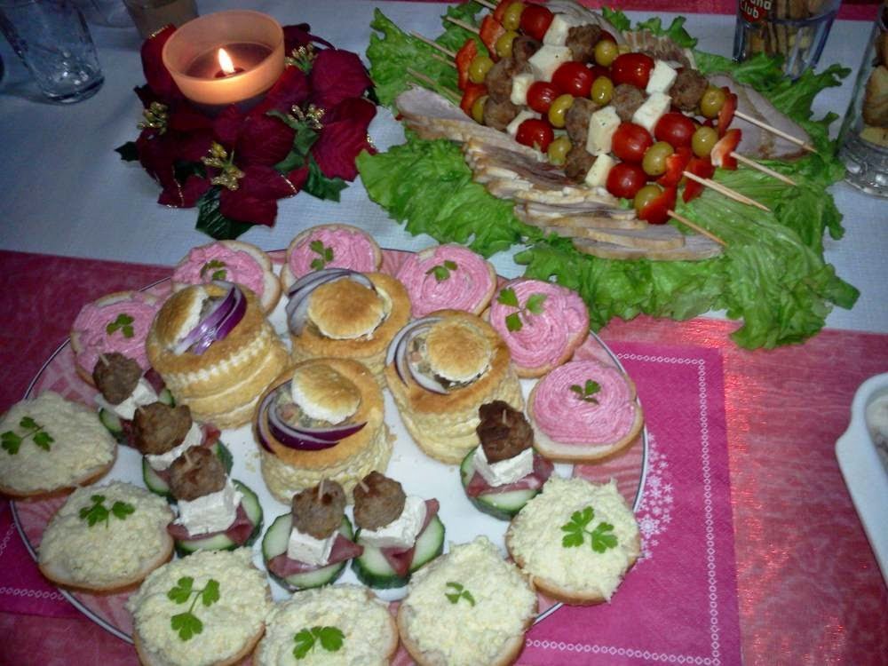 2.Platou cu salata de icre si salata de telina pe felioare de paine+ vol-au-vent umplut cu bucatele de jambon prajit si castraveti murati amestecate cu maioneza si ornat cu ceapa rosie+ Felie de castravete cu felioare subtiri de jambon, branza feta si chiftelute impifte cu scobitori