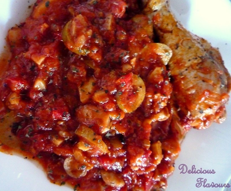 Condimentam pulpele cu sare si piper si le sotam pana se rumenesc pe ambele parti in putin ulei de masline incins. Intre timp tocam ceapa, pisam usturoiul, taiem cubulete mici ardeiul si feliem maslinele. Daca pulpele sunt gata, le scoatem si le punem deoparte. In acelasi ulei calim ceapa cateva minute, apoi adaugam si usturoiul si mai lasam circa 1 minut sa se caleasca impreuna. Adaugam ardeiul, ciupercile, maslinele, cutia de rosii, frunza de dafin, cimbrul si oregano, condimentam cu sare si piper. Lasam sosul pe foc mediu cam 15-20 minute, dupa care punem pulpele de pui intr-un vas termorezistent cu capac, le acoperim cu sosul de rosii si dam la cuptorul preincalzit circa 45 minute.